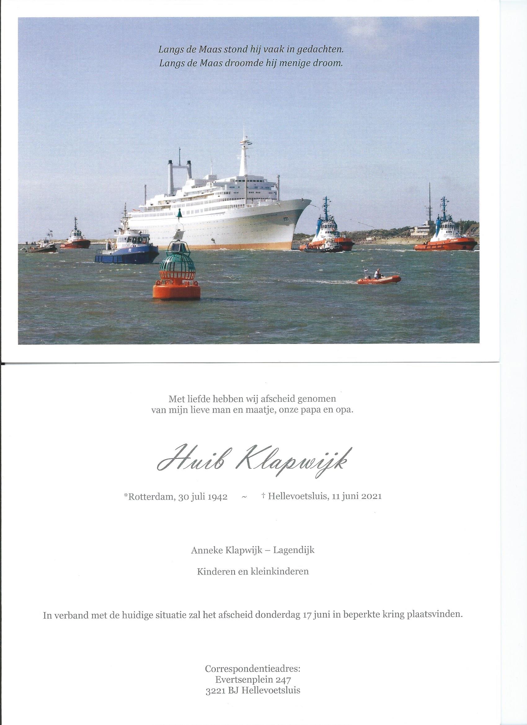 Het bestuur van de Genealogische Vereniging Klapwijk heeft het droevige bericht ontvangen dat oud-bestuurslid Huib Klapwijk is overleden. Wij wensen Anneke, de kinderen en kleinkinderen heel veel sterkte.